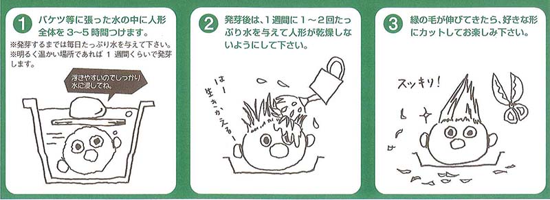 お届け時は、頭の毛の部分にあたるところに、グリーンは生えていないのですが、水やりをすることで、髪の毛のように伸びてきます。楽しい植物栽培キット 頭から牧草が生えるイタリアンライグラスの栽培セットになっております。ガーデニング用のグッズではありますが、思わぬところでも人気があります。