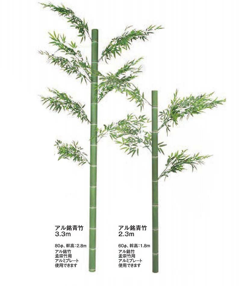 青竹は緑色の竹になります。アル銘竹孟宗竹はアルミ製になっております。キャップ付きではありません。時間が経って天然竹のような割れが生じることがないので装飾として使いやすいです。銘竹孟宗竹単体では屋外でも使用可能ですが、リーフ(葉)部分を使用する場合は、リーフ(葉)は屋外不可です。追加のリーフ(葉)は別売りでご用意いたしております。※装飾用ですので、柱材など郷土を必要とする場所では使用できません。