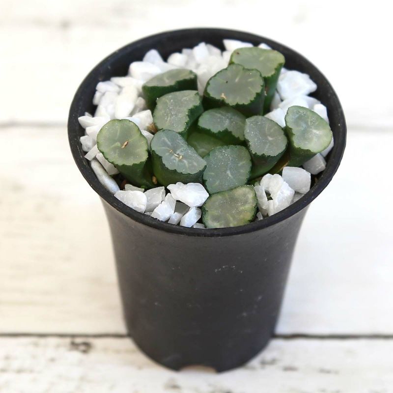 人気のある多肉植物のひとつで、珍しい植物です。葉の部分が水平に切られたようになっておりユニークな形をしています。土植えで、土の表面に化粧石をしています。葉に窓のようなものがあり、窓の色合い、模様、光も透過具合などを楽しむことができます。