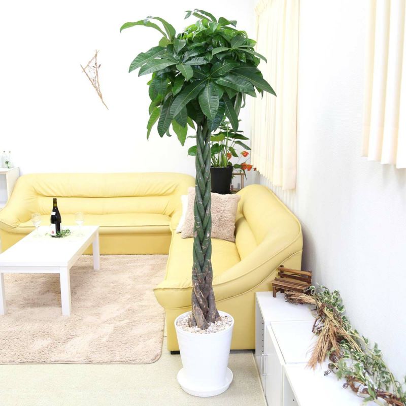 大型サイズのパキラです。洋風なお部屋でも和風なお部屋でも素敵にマッチ!1鉢、飾るだけで、存在感バッチリでお部屋やオフィスに潤いが。届いたその日からとっても心地よい空間に♪どこでも気軽に置けて、生長が早く管理も楽。贈り物などにも大変、喜ばれますよ! 温室の中ですくすくと育っている生き生きとした新鮮なパキラを、 心を込めてお届けさせていただきます!陶器風なおしゃれなプラスチック鉢植えでのお届けです。