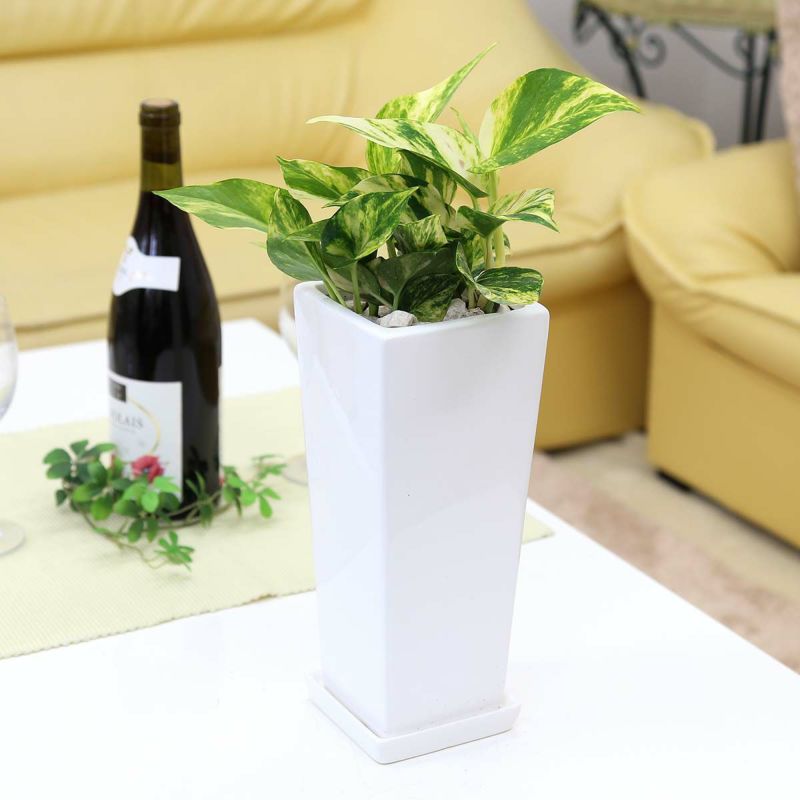 【送料無料】ポトス 5号 ホワイトスクエア陶器鉢 ストレート+陶器製のお皿付き