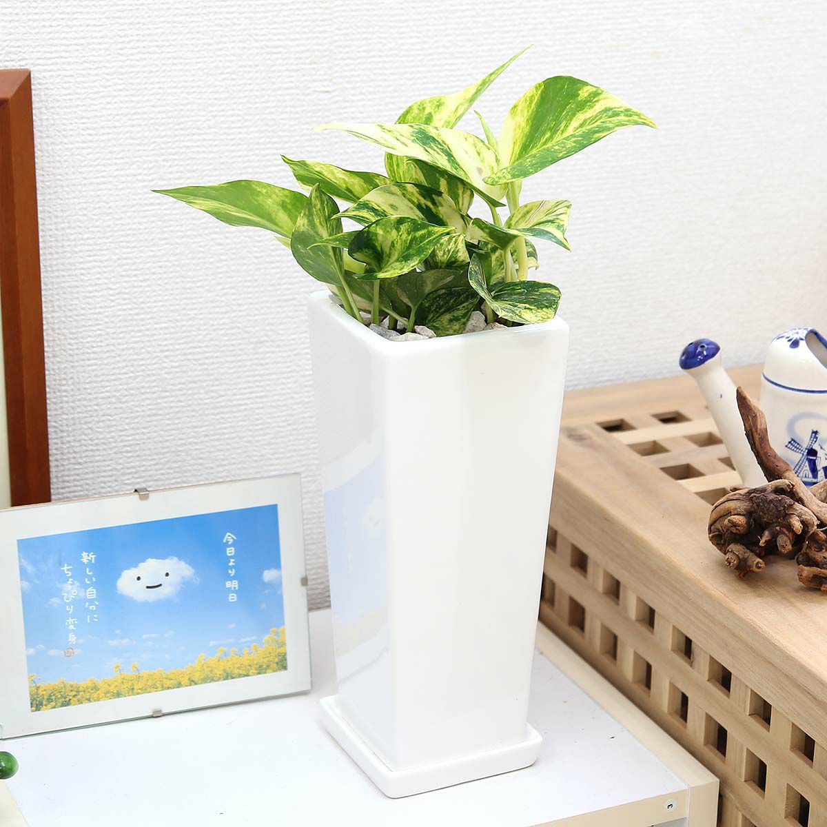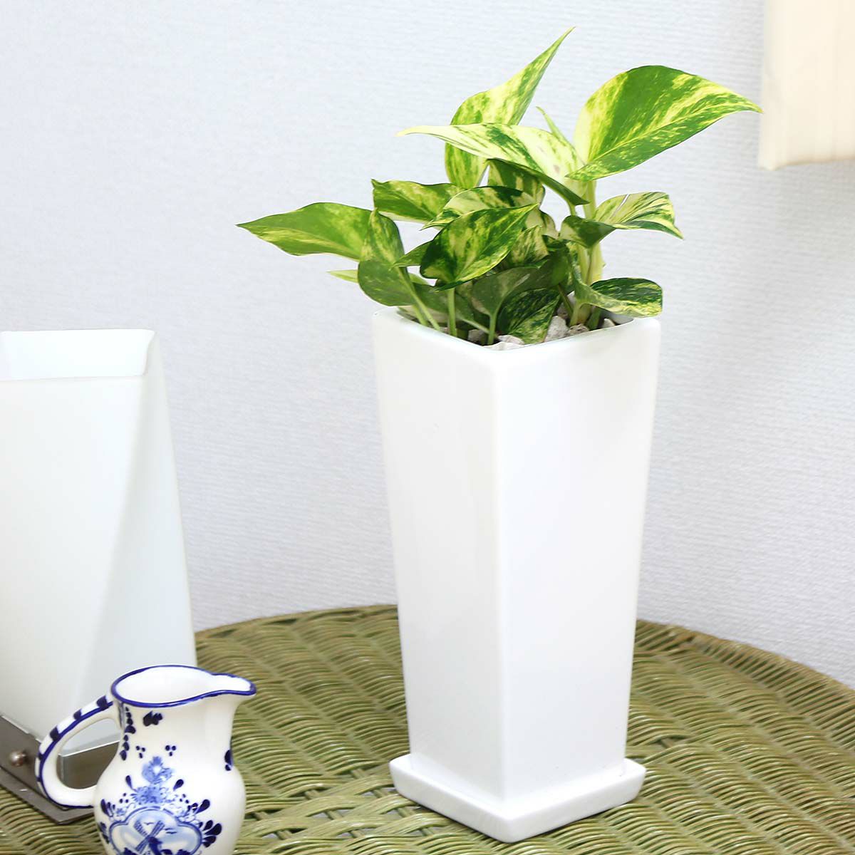 他の画像を見る 【送料無料】空気も浄化するといわれているポトス 5号 ホワイトスクエアプラスチック鉢+お皿付き 当店特別価格 ¥ 2,999 税込 植物 サイズ 設置後高さ: 約20~25cm お気に入りに登録する